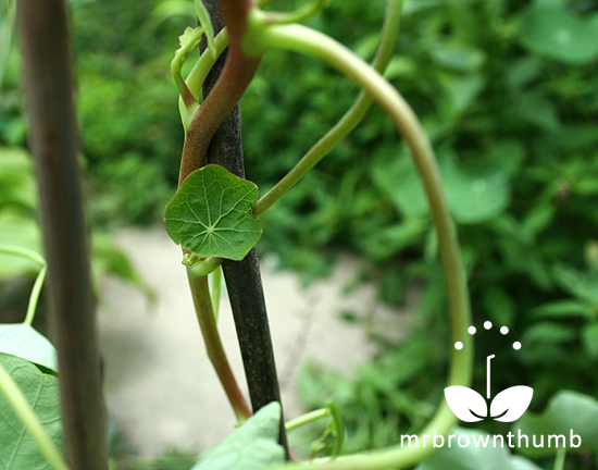 "Spitfire" has foliage that is an average green, unlike some nasturtiums that have a blueish hue to them, the darker foliage of nasturtium "Empress of India," or the variegated foliage of nasturtium "Alaska." When the foliage gets long enough to start training up a support structure like a trellis or a fence all you have to do it wind the longest stems up and around. Some stems may break near the tips but they'll quickly be covered up my more vines and leaves, and of course more blooms.