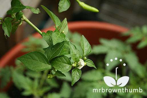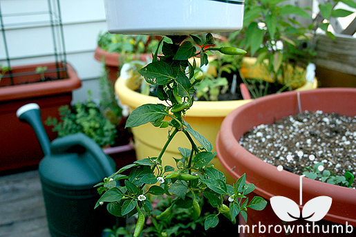 I used what I was told was a pequin pepper* which remains a relatively small plant throughout my growing season. I chose this small pepper because the container is small, it used to hold 5lbs of potato salad, it wouldn't get too big or heavy for the container.