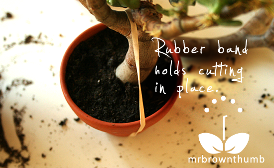 Have you ever noticed how newly planted trees are tied to stakes around them? This is done for stability, allowing the tree to form roots that will anchor it into the soil. The same thing applies here. You can stabilize your cutting using some chopsticks and string. I like to use rubber bands to hold them in place like so to keep them from falling over.
